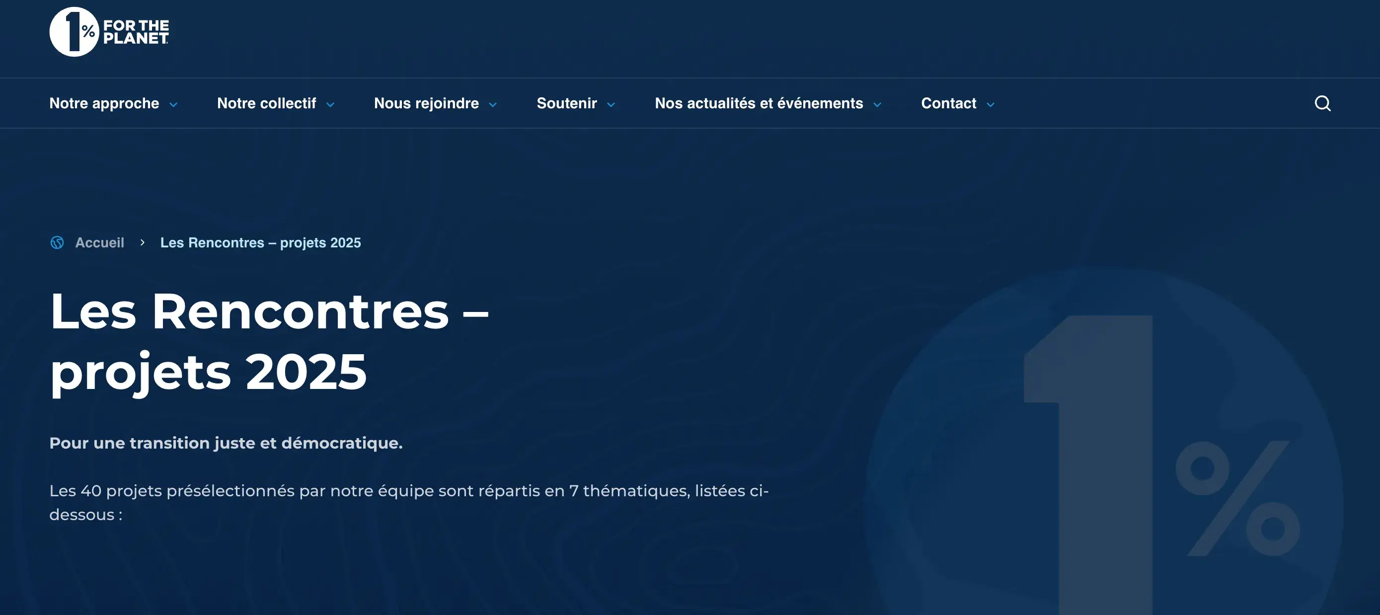 40 projets présélectionnés par l'équipe 1% for the planet pour pitcher lors des Rencontres pour la Planète 2025 et répartis en 7 thématiques à découvrir ici.